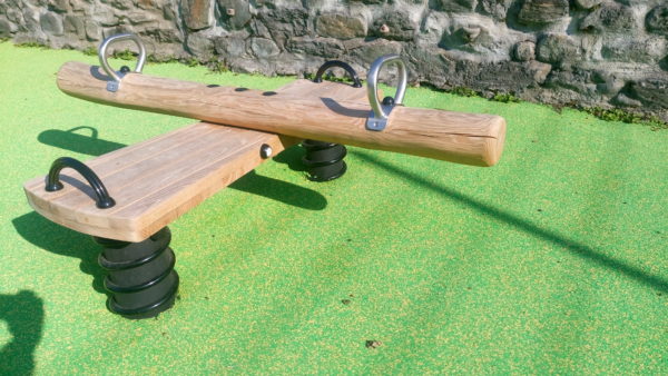 Réalisation complète d’une aire de jeux en Robinier, structure multifonctionnelle, jeux d’équilibres et balançoire. Revêtement de l’aire de jeux en sol souple.