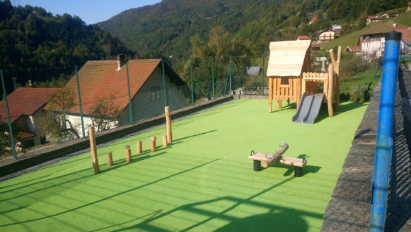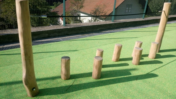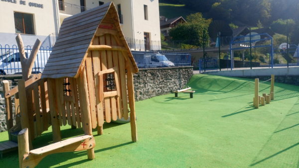Réalisation complète d’une aire de jeux en Robinier, structure multifonctionnelle, jeux d’équilibres et balançoire. Revêtement de l’aire de jeux en sol souple.